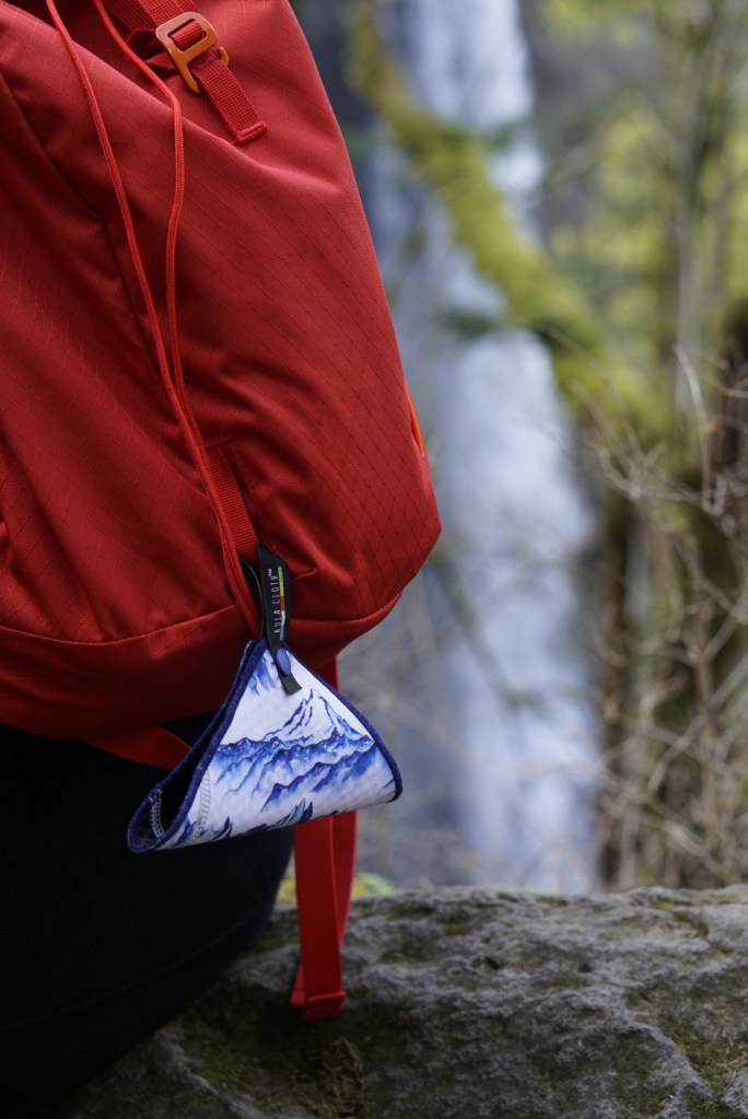 The cloths feature one-of-a-kind prints by mountain artists like Nikki Frumkin and Claire Giordano, whose art has been featured by major retailers like REI and in magazines like Alpinist. Other thoughtful features include the reflective stitching, to ensure you can always find your Kula even in the darkest forest, and a snap closure loop to easily hang from your bag.